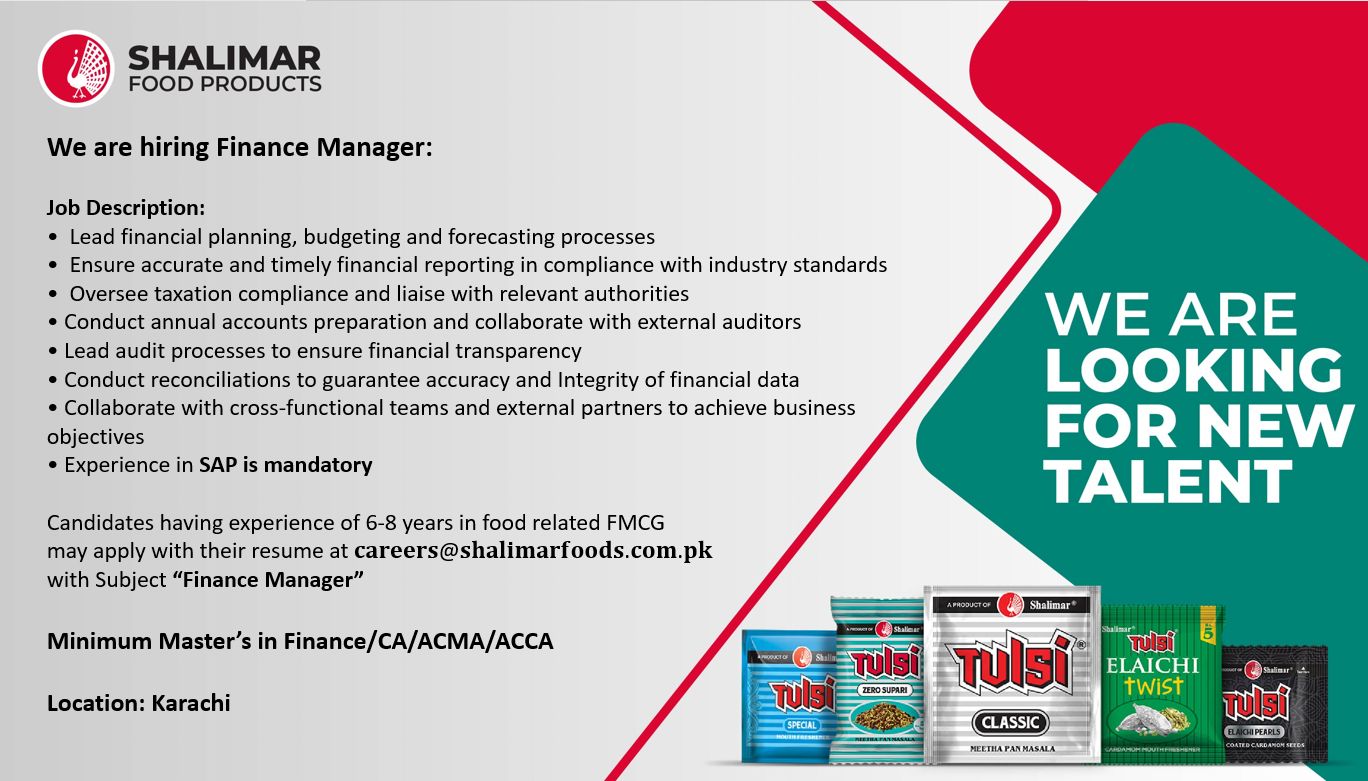 Please read the requirements carefully before applying. The last date to apply is [insert application deadline]. Only shortlisted candidates will be contacted. Interested candidates may send their resume to careers@shalimarfoods.com.pk with the subject “Finance Manager”.