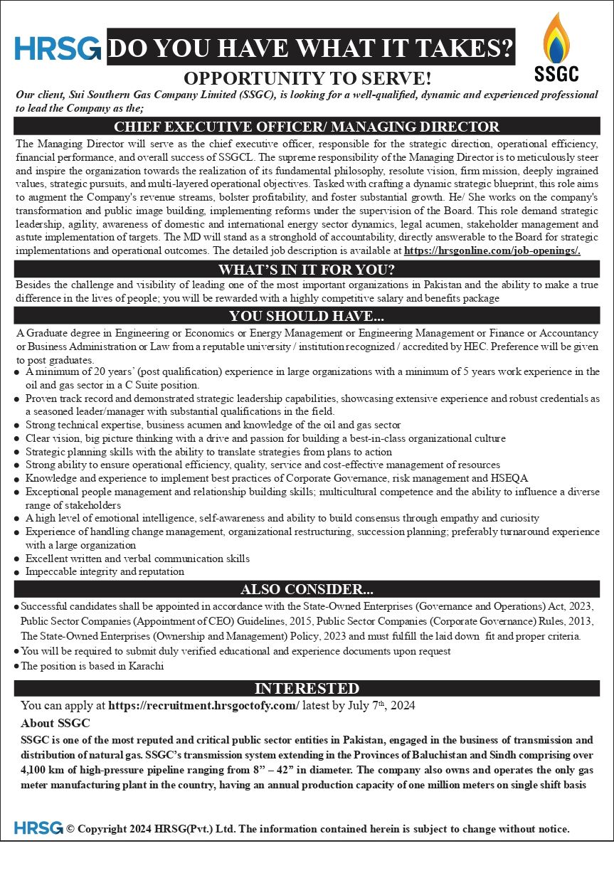 Our client, Sui Southern Gas Company Limited (SSGC), is seeking a well-qualified, dynamic, and experienced professional to lead the company as the Chief Executive Officer/Managing Director. The Managing Director will serve as the chief executive officer, responsible for the strategic direction, operational efficiency, financial performance, and overall success of SSGCL. The supreme responsibility of the Managing Director is to meticulously steer and inspire the organization towards the realization of its fundamental philosophy, resolute vision, firm mission, deeply ingrained values, strategic pursuits, and multi-layered operational objectives. Tasked with crafting a dynamic strategic blueprint, this role aims to augment the company’s revenue streams, bolster profitability, and foster substantial growth. He/She works on the company’s transformation and public image building, implementing reforms under the supervision of the Board. This role demands strategic leadership, agility, awareness of domestic and international energy sector dynamics, legal acumen, stakeholder management, and astute implementation of targets. The MD will stand as a stronghold of accountability, directly answerable to the Board for strategic implementations and operational outcomes. The detailed job description is available at HRSG Online.