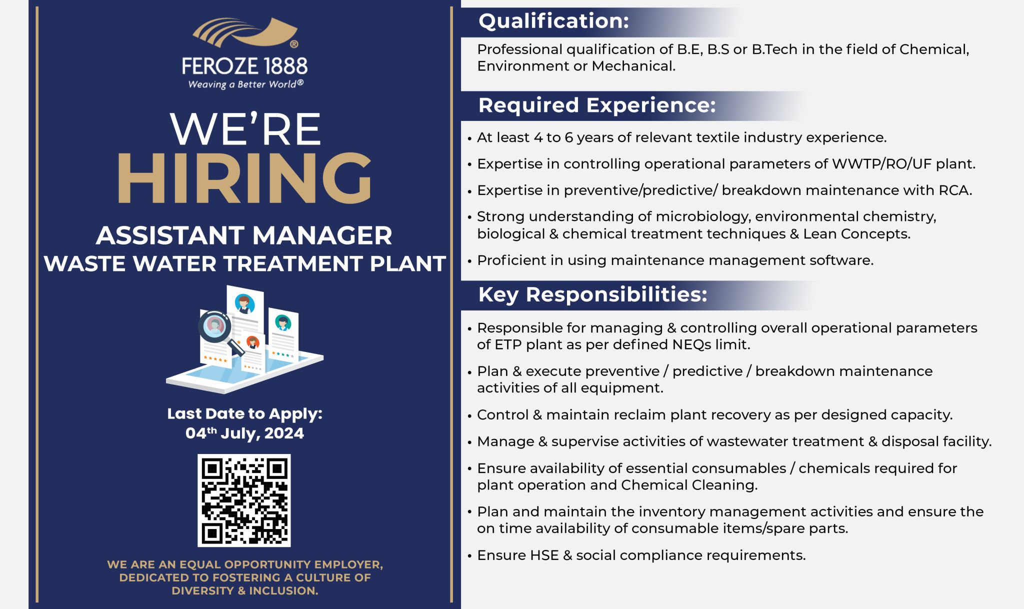 Feroze 1888 is seeking a dedicated and experienced professional to join our team as an Assistant Manager for our Waste Water Treatment Plant. The successful candidate will be responsible for managing and controlling the overall operational parameters of the ETP plant, ensuring compliance with NEQS limits. This role involves planning and executing preventive, predictive, and breakdown maintenance activities, managing reclaim plant recovery, and supervising the wastewater treatment and disposal facility. The candidate will also ensure the availability of essential consumables and chemicals, maintain inventory management activities, and uphold HSE and social compliance requirements.