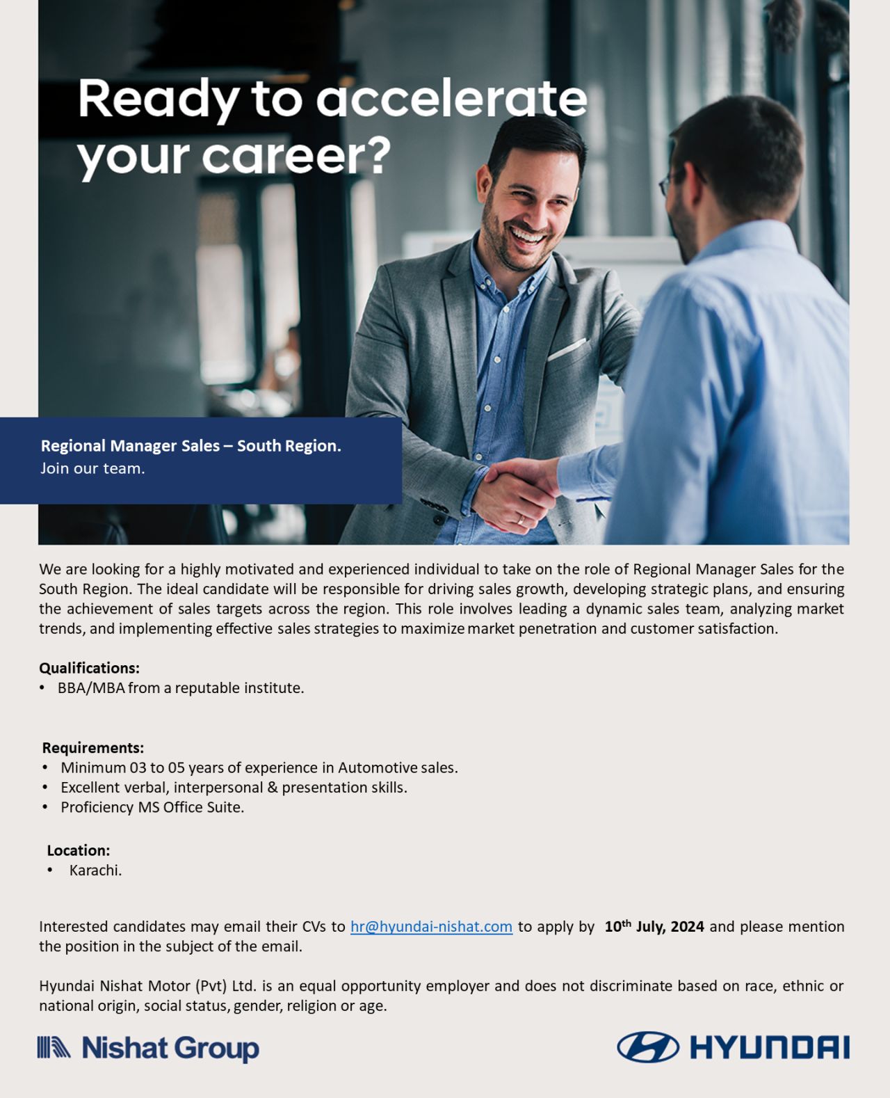 Position Title: Regional Manager Sales – South Region Job Type: Full-Time Job Category: Sales Job Location: Karachi Gender: Any Education: BBA/MBA from a reputable institute Experience: Minimum 03 to 05 years of experience in Automotive sales