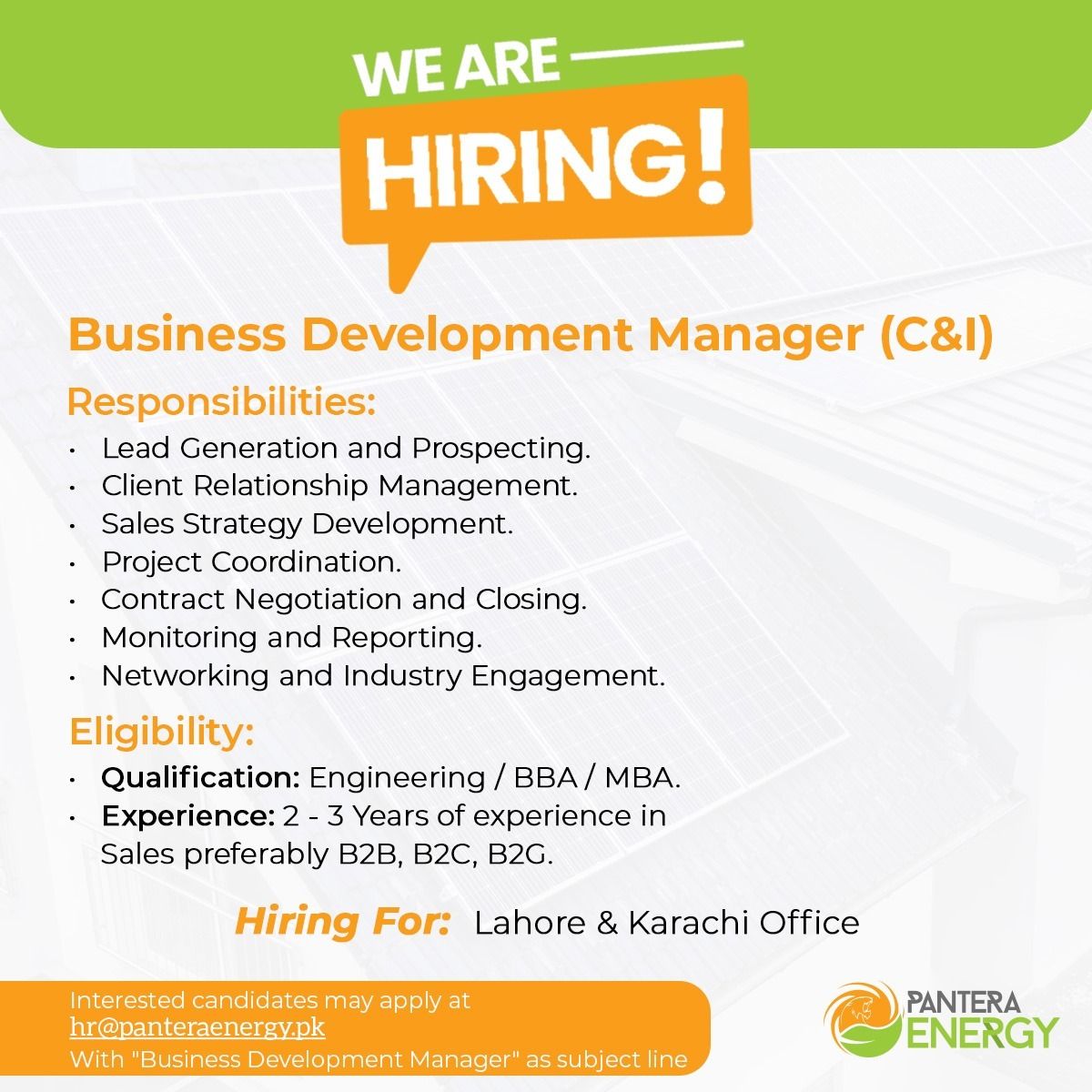 Please read the requirements carefully before applying. The last date to apply is [Insert Last Date to Apply]. Only shortlisted candidates will be contacted. Interested candidates may apply by sending their CV to hr@panteraenergy.pk with “Business Development Manager” as the subject line.