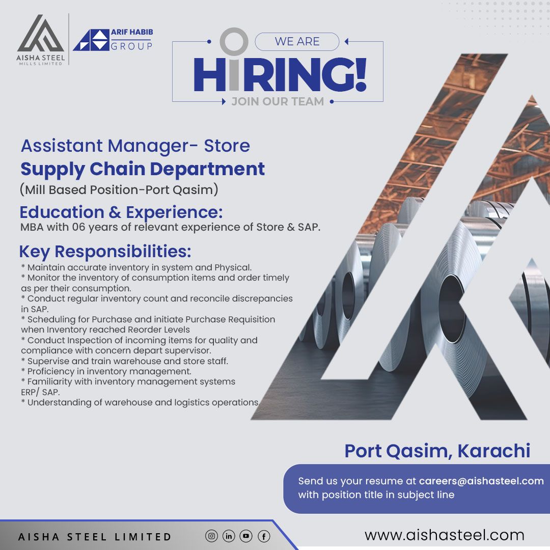 Aisha Steel Mills Limited, a part of the Arif Habib Group, is seeking a highly motivated and experienced Assistant Manager for our Store Supply Chain Department, based at our mill in Port Qasim, Karachi. The successful candidate will be responsible for maintaining accurate inventory in both the system and physically, monitoring the inventory of consumption items, and ensuring timely ordering as per their consumption. The role involves conducting regular inventory counts, reconciling discrepancies in SAP, scheduling for purchase, initiating purchase requisitions when inventory reaches reorder levels, and inspecting incoming items for quality and compliance. Additionally, the Assistant Manager will supervise and train warehouse and store staff, and must be proficient in inventory management and familiar with ERP/SAP systems.