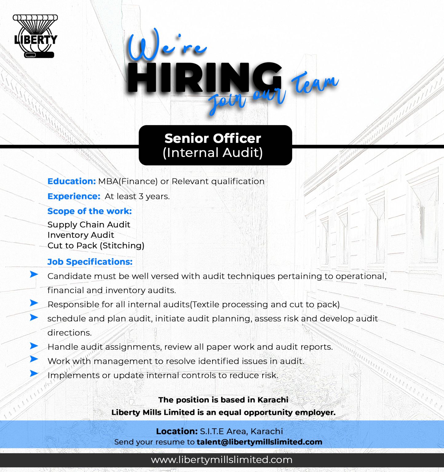 Liberty Mills Limited is seeking a highly skilled Senior Officer (Internal Audit) to join our team. The successful candidate will be responsible for conducting comprehensive internal audits across various departments, including supply chain, inventory, and cut-to-pack (stitching) operations. The role involves scheduling and planning audits, assessing risks, and developing audit directions. The Senior Officer will handle audit assignments, review paperwork, and audit reports, and work with management to resolve identified issues. The candidate must be well-versed in audit techniques related to operational, financial, and inventory audits, and implement or update internal controls to reduce risk.