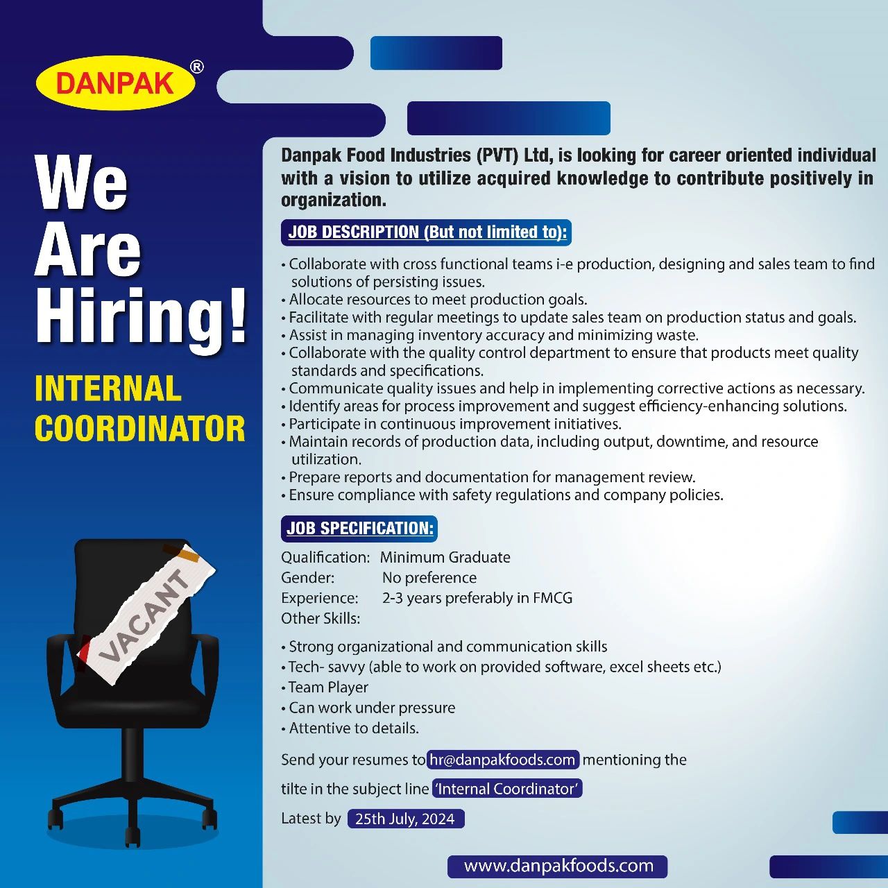 Please read the requirements carefully before applying. The last date to apply is 25th July, 2024. Only shortlisted candidates will be contacted. Send your resumes to hr@danpakfoods.com mentioning the title in the subject line ‘Internal Coordinator’. For more information, visit www.danpakfoods.com.