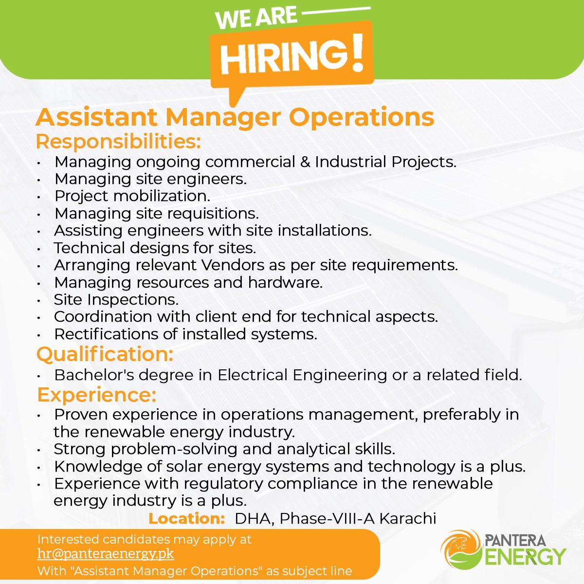 Please read the requirements carefully before applying. The last date to apply is [insert date]. Only shortlisted candidates will be contacted. Interested candidates may apply by sending their CV to hr@panteraenergy.pk with “Assistant Manager Operations” as the subject line.