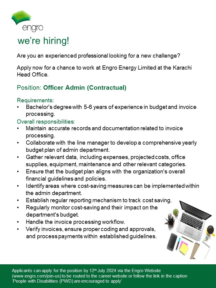Please read the requirements carefully before applying. The last date to apply for this position is 12th July 2024. Only shortlisted candidates will be contacted. Applicants can apply for the position via the Engro Website (www.engro.com/join-us) to be routed to the career website. People with Disabilities (PWD) are encouraged to apply.