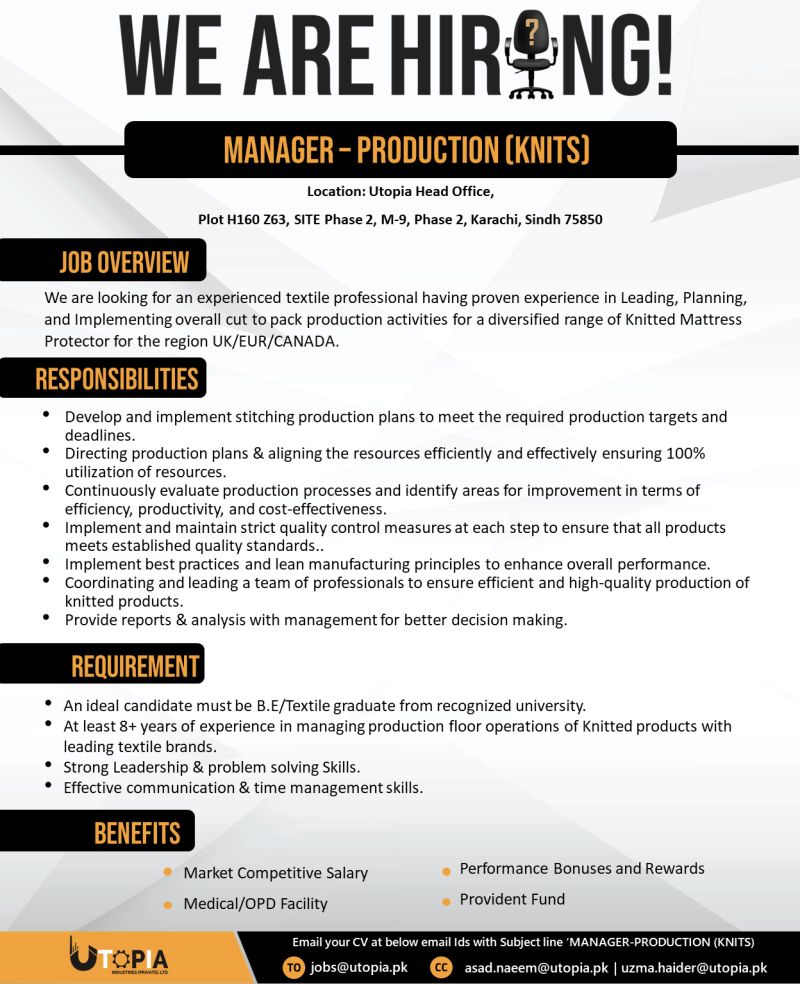 Please read the requirements carefully before applying. The last date to apply is [insert last date]. Only shortlisted candidates will be contacted. Email your CV with the subject line ‘MANAGER-PRODUCTION (KNITS)’ to jobs@utopia.pk. You can also send your CV to asad.naeem@utopia.pk and uzma.haider@utopia.pk.