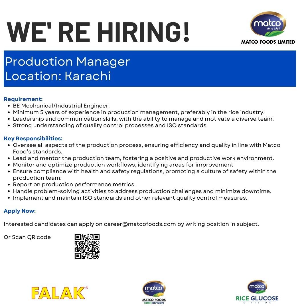 Matco Foods Limited is seeking a dedicated and experienced Production Manager to join our team in Karachi. The successful candidate will oversee all aspects of the production process, ensuring efficiency and quality in line with Matco Food’s standards. This role requires strong leadership and communication skills to manage and motivate a diverse team. The Production Manager will monitor and optimize production workflows, ensure compliance with health and safety regulations, and report on production performance metrics. A key part of this role is implementing and maintaining ISO standards and other relevant quality control measures to promote a culture of safety within the production team.