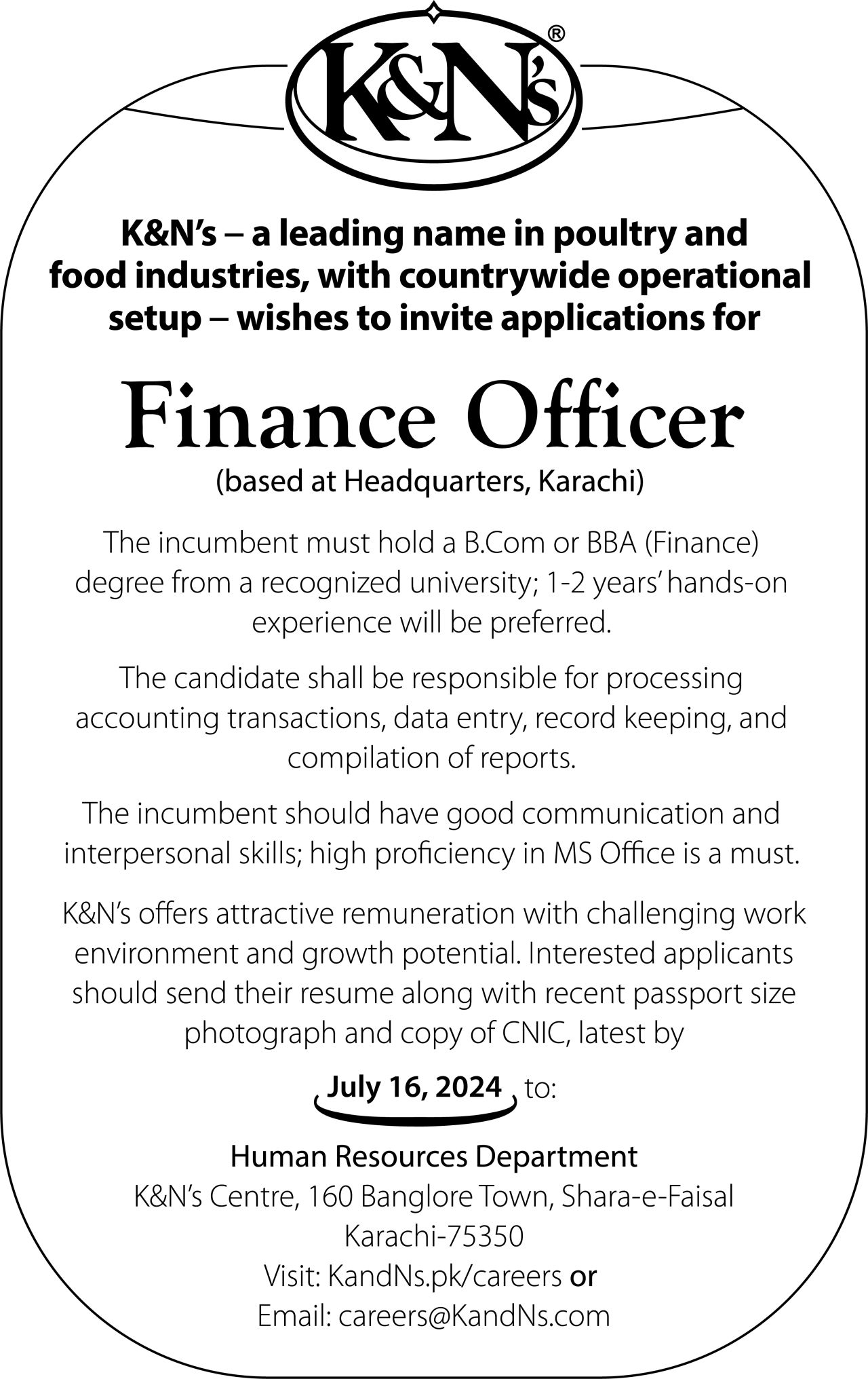 K&N’s – a leading name in poultry and food industries, with a countrywide operational setup – wishes to invite applications for the position of Finance Officer (based at Headquarters, Karachi). The incumbent must hold a B.Com or BBA (Finance) degree from a recognized university; 1-2 years’ hands-on experience will be preferred. The candidate shall be responsible for processing accounting transactions, data entry, record keeping, and compilation of reports. The incumbent should have good communication and interpersonal skills; high proficiency in MS Office is a must. K&N’s offers attractive remuneration with a challenging work environment and growth potential.