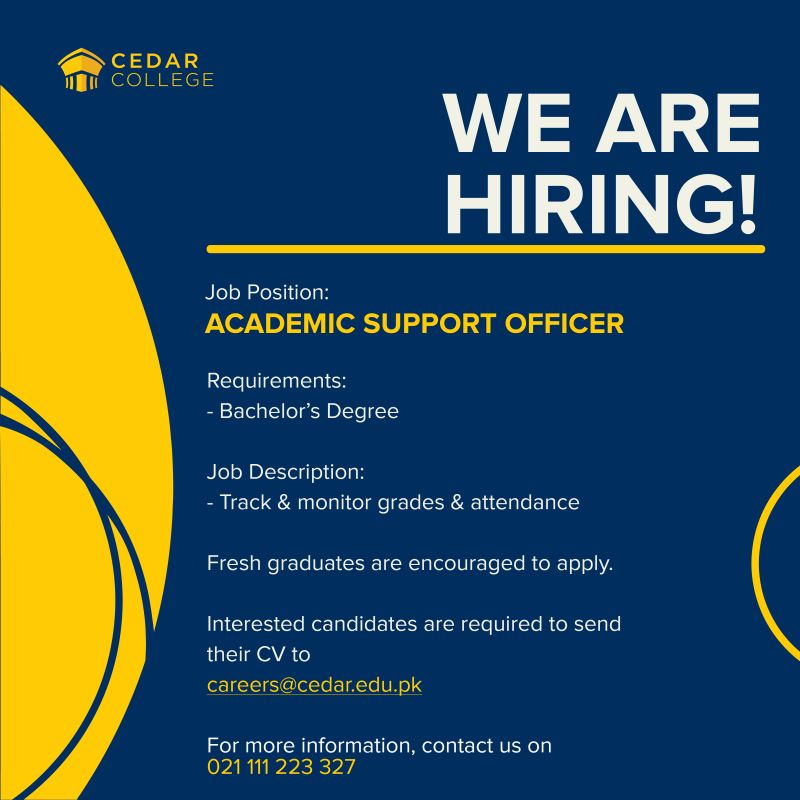Position Title: Academic Support Officer Job Type: Full-time Job Category: Education Job Location: Cedar College, Karachi Gender: Any Education: Bachelor’s Degree Experience: Fresh graduates are encouraged to apply