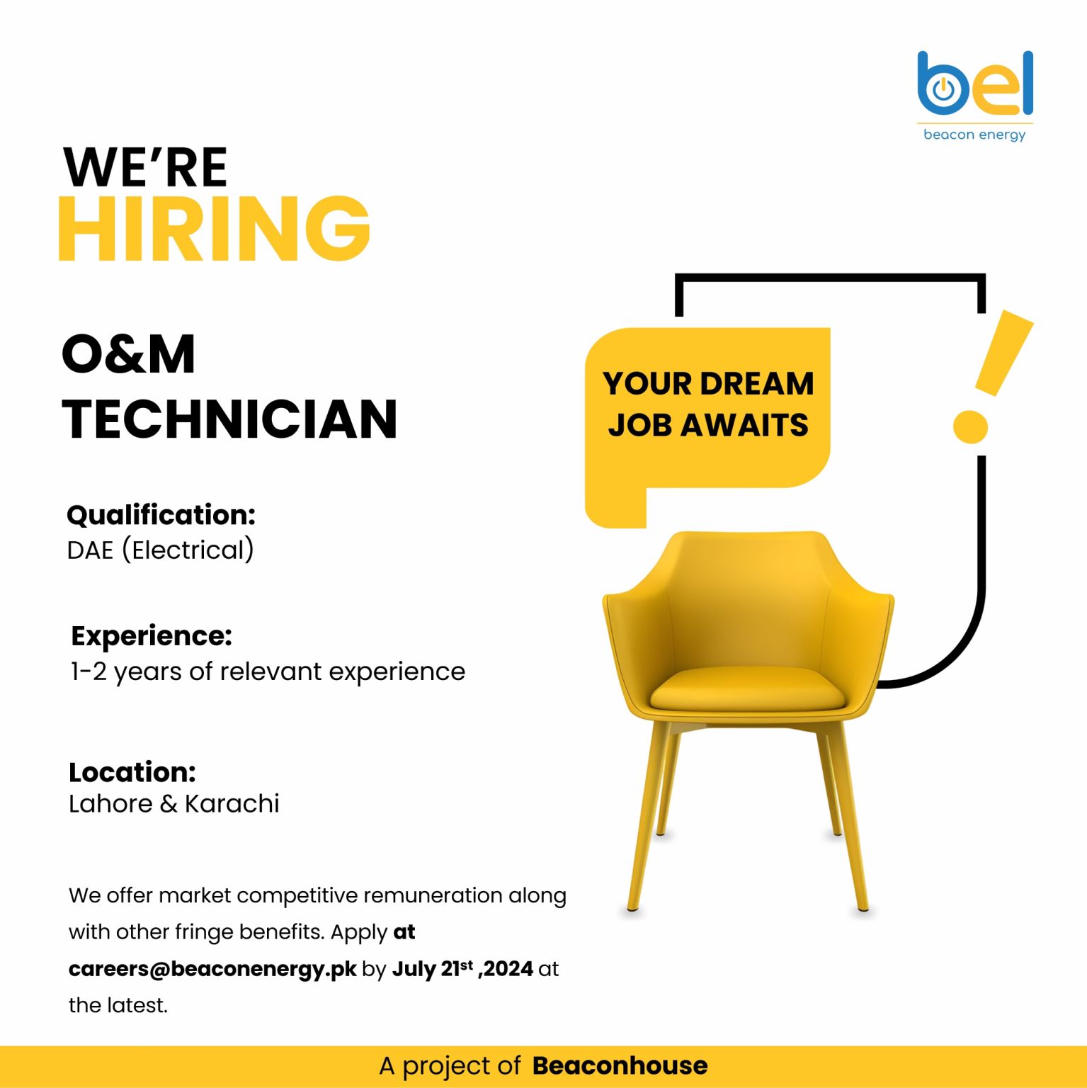 Beacon Energy is seeking skilled and motivated O&M Technicians to join our dynamic team in Lahore and Karachi. As an O&M Technician, you will be responsible for the operation and maintenance of our electrical systems, ensuring optimal performance and reliability. This role offers a unique opportunity to work on cutting-edge projects within the energy sector, contributing to the sustainable energy goals of Beacon Energy. We provide a market competitive remuneration package along with other fringe benefits.