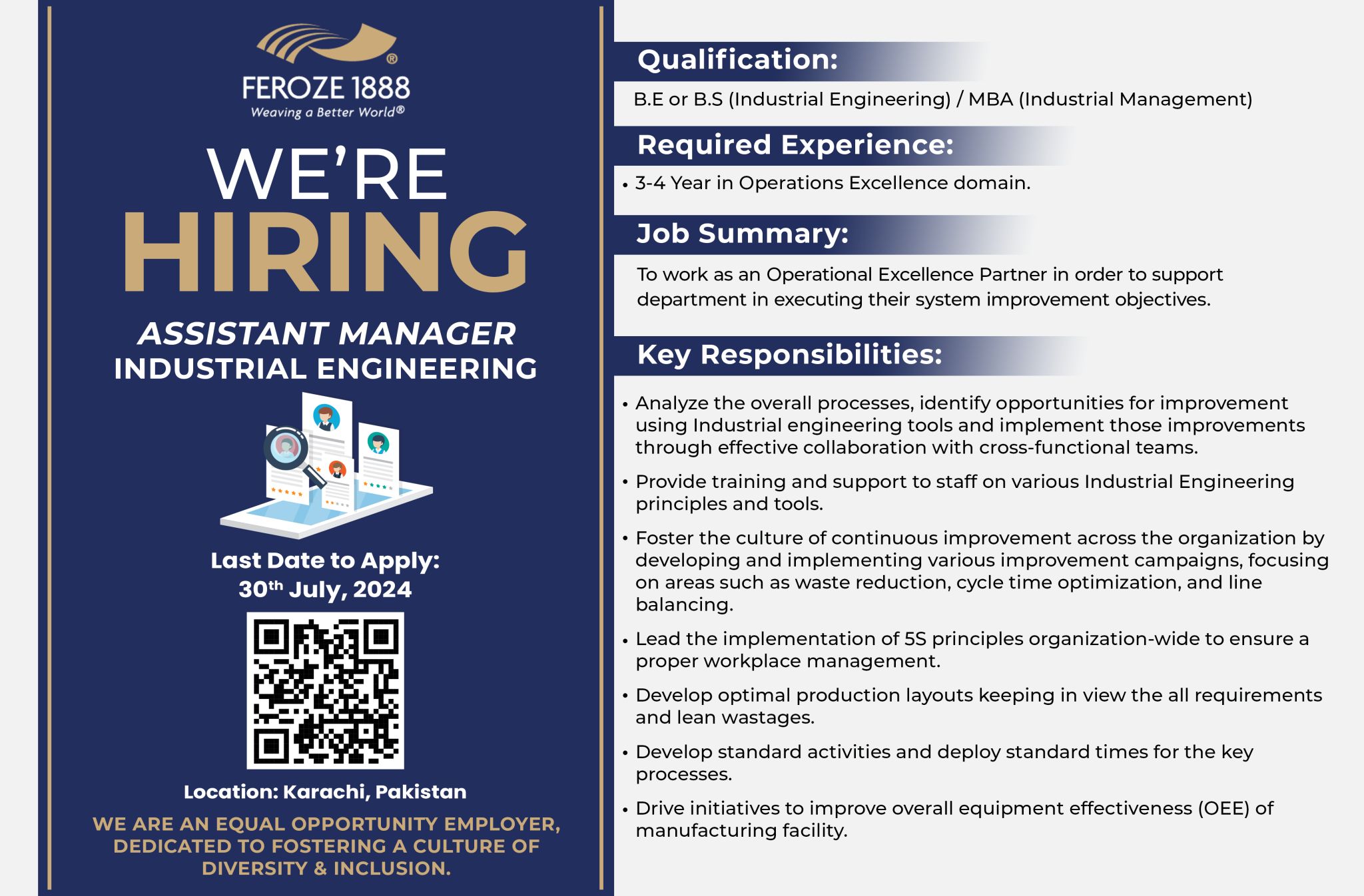 - Position Title: Assistant Manager Industrial Engineering