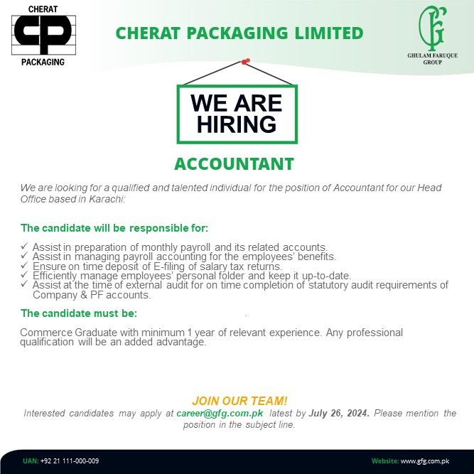 Cherat Packaging Limited, a part of the Ghulam Faruque Group, is seeking a qualified and talented individual for the position of Accountant for our Head Office based in Karachi. The selected candidate will assist in the preparation of monthly payroll and its related accounts, manage payroll accounting for employee benefits, and ensure timely deposit of e-filing for salary tax returns. Additionally, the candidate will efficiently manage employees’ personal folders, keeping them up-to-date, and assist during external audits to ensure the timely completion of statutory audit requirements for the company and PF accounts. A commerce graduate with a minimum of 1 year of relevant experience is required. Any professional qualification will be considered an added advantage.