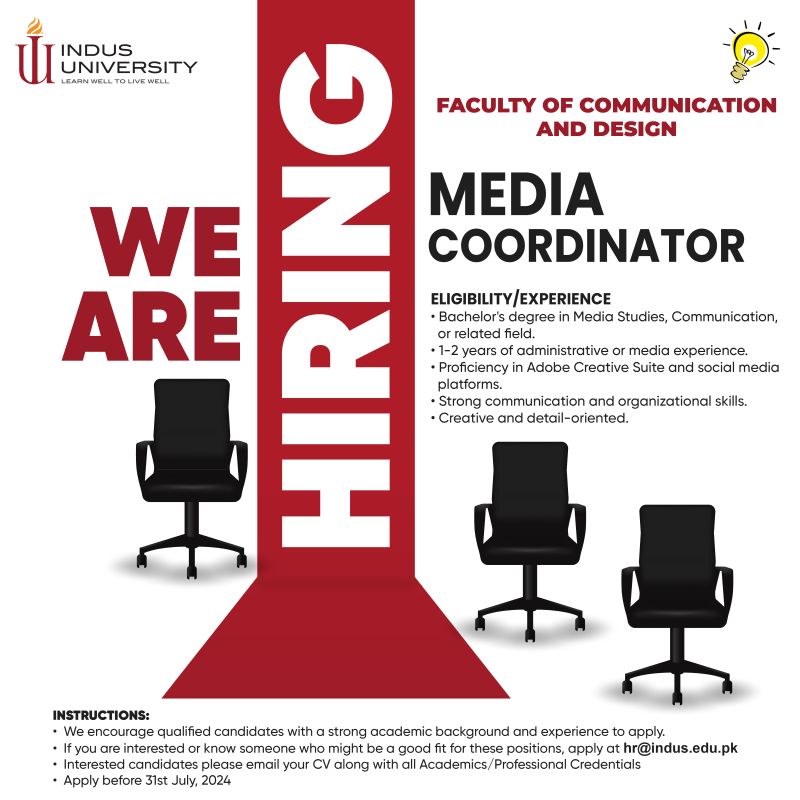 Indus University is seeking a dynamic and detail-oriented Media Coordinator for the Faculty of Communication and Design. The ideal candidate will possess a Bachelor’s degree in Media Studies, Communication, or a related field, along with 1-2 years of administrative or media experience. Proficiency in Adobe Creative Suite and social media platforms is essential. The successful candidate will have strong communication and organizational skills, and will be both creative and detail-oriented.