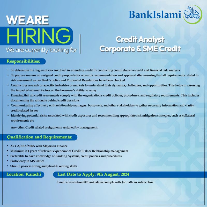 Please read the requirements carefully before applying. The last date to apply is 9th August, 2024. Only shortlisted candidates will be contacted. Send your CV to recruitment@bankislami.com.pk with the Job Title in the subject line.
