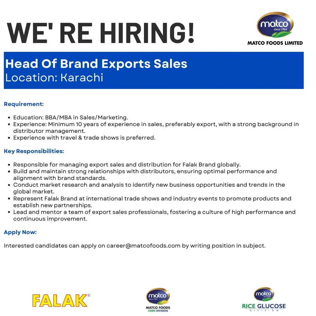 Please read the requirements carefully before applying. The last date to apply is [insert date]. Only shortlisted candidates will be contacted. Interested candidates can apply by sending their CV to career@matcofoods.com, mentioning the position in the subject line.