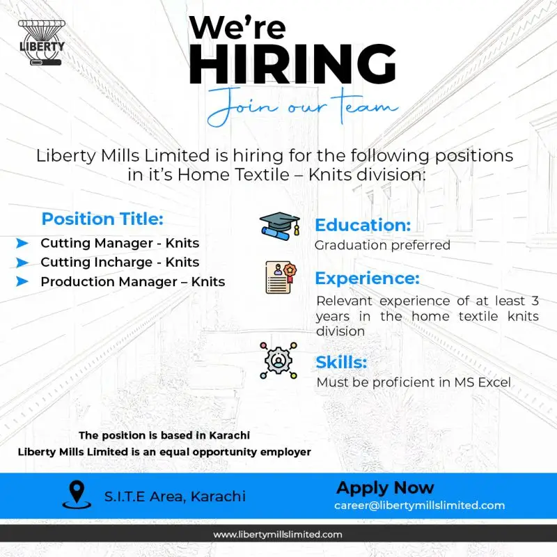 Please read the job requirements carefully before applying. Ensure that your qualifications and experience match the job criteria. The last date to apply for these positions is [insert deadline]. Only shortlisted candidates will be contacted for further process. We appreciate your interest in joining Liberty Mills Limited.